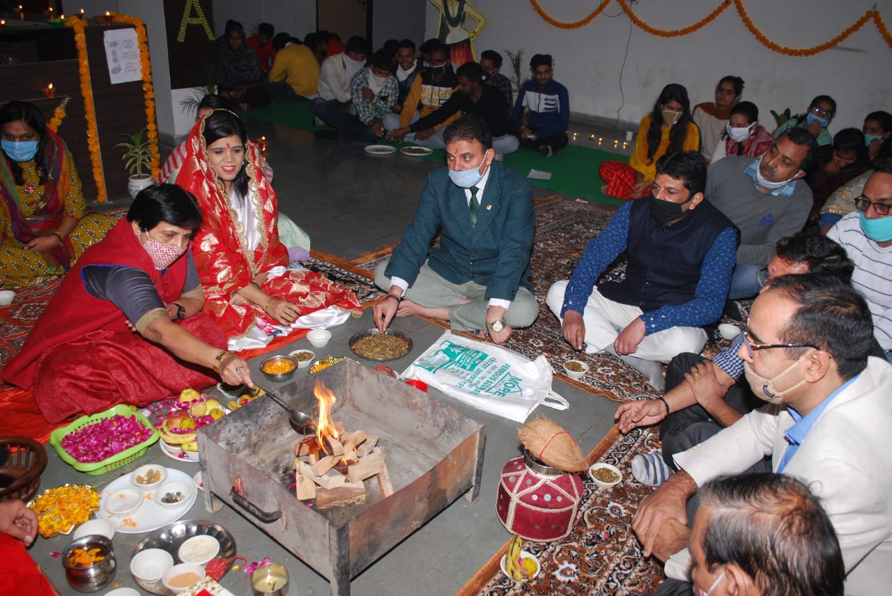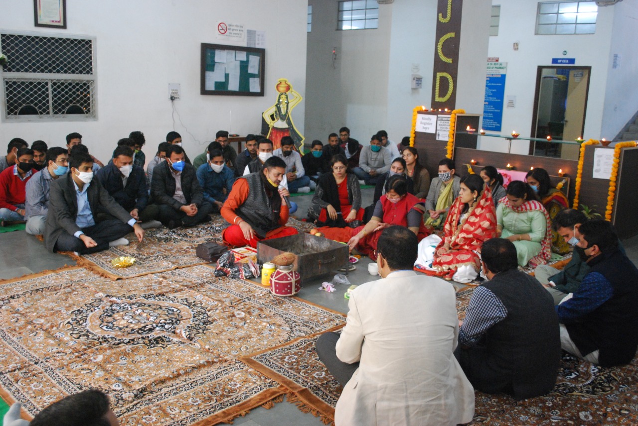 सिरसा 19 नवंबर , 2020 : जेसीडी कॉलेज ऑफ फार्मेसी में फार्मेसी वींक की शुरूआत बहुत ही अध्यात्मिक विधि से हुई जिसमें हवन यज्ञ का आयोजन किया गया । इस अवसर पर जेसीडी विद्यापीठ के प्रबंधक निर्देशक डॉ.शमीम शर्मा ने बतौर मुख्य अतिथि शिरकत की ! प्राचार्या डॉ.अनुपमा सेतिया ने मुख्य अतिथि एवं सभी अतिथिगण का स्वागत किया ! इस प्रोग्राम में मुख्यअतिथि एवं सभी अतिथि गण के साथ- साथ अध्यापक व छात्र-छात्राओं ने भी आहुति डालकर नए शैक्षणिक सत्र की भी शुरूआत की। इस अवसर पर जेसीडी विद्यापीठ के प्रबंधक निर्देशक डॉ शमीम शर्मा ने शिक्षकों व छात्रों को शुभकामनाएं देते हुए कहा कि नए सत्र में विद्यार्थी एवं अध्यापक नए लक्ष्य निर्धारित करके उनके हासिल करने की कोशिश करें। बगैर लक्ष्य निर्धारित किए कि गई मेहनत का कोई फायदा नहीं होता है। किसी भी कार्य के पीछे समय बहुत ही महत्व रखता है और उस कार्य पर किए जाने वाले परिश्रम के कारण ही ईश्वर हमारी मदद करता है।